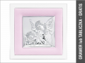 Aniołek z latarenką nad dzieckiem - srebrny obrazek na różowym materiale na białym drewnie 75020
