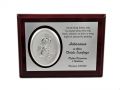 Pamiątka Chrztu Św. - owalny srebrny obrazek z Aniołkiem na wiśniowym podkładzie