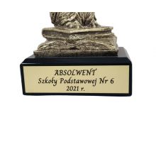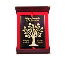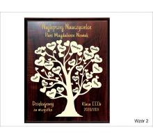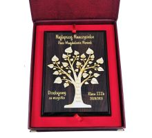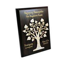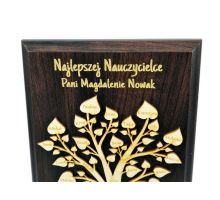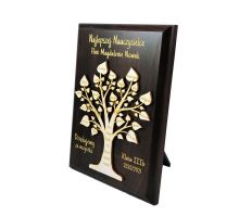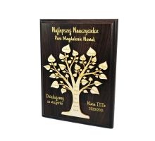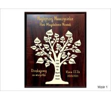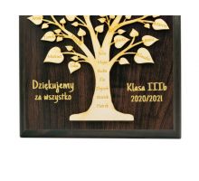 Dedykacja z okazji zakończenia szkoły czy nauki wygrawerowana jest w srebrnym laminacie umieszczonym na drewnianym podkładzie.